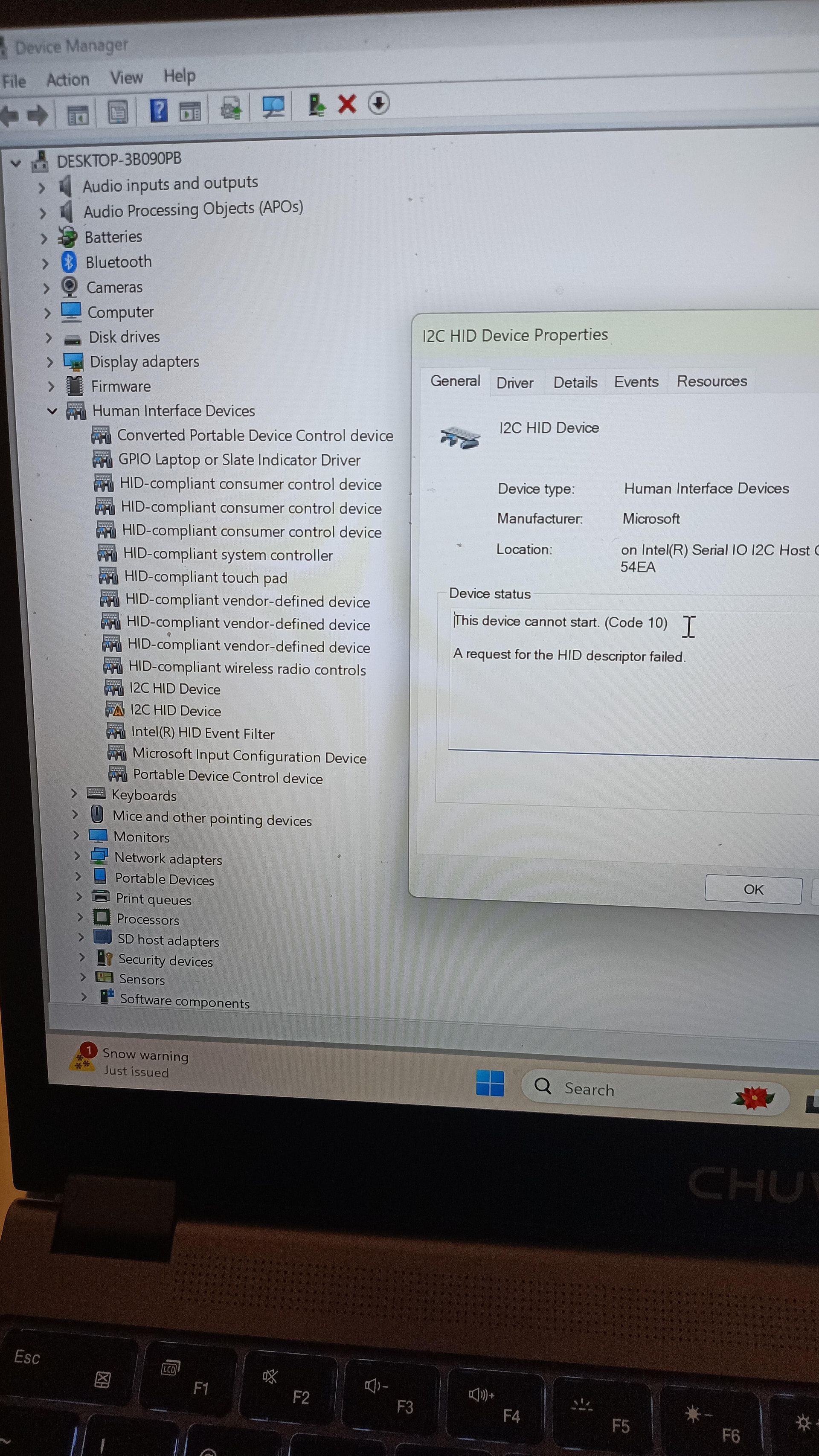 Approximately month ago the touchscreen stopped working. Futhermore, laptop isnt recognizing the tablet mode if you rotate the screen now. It looks like the problem is in that HID device which is giving the error code 10. Ive tried tons of drivers from this forum and internet, also tried drivers from chuwi support, but their archive doesen’t contain anything about display. Last step was reinstalling the system from official chuwi support site - but the error is still here. Can you help me?